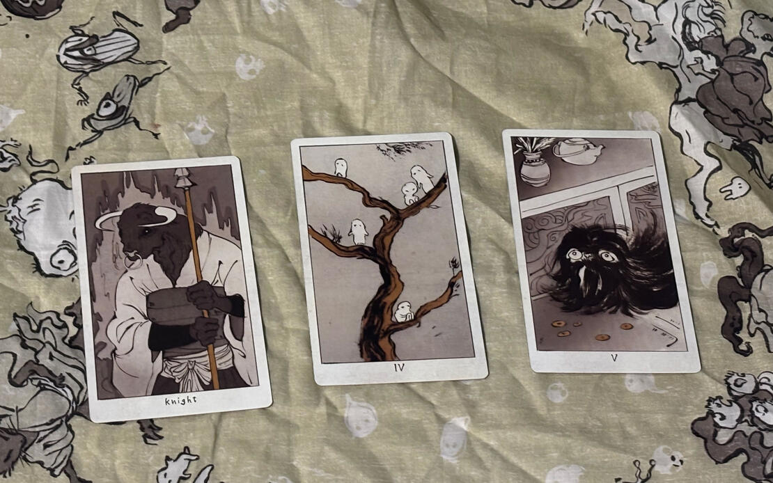 All readings I do involve actual draws of physical cards. I typically use the Yokai Yochi tarot deck from buboplague. As a cherished gift from my partner, and as beautiful art filled with spirits, it helps me find connection in my own heart, a path to seek deeper meaning.