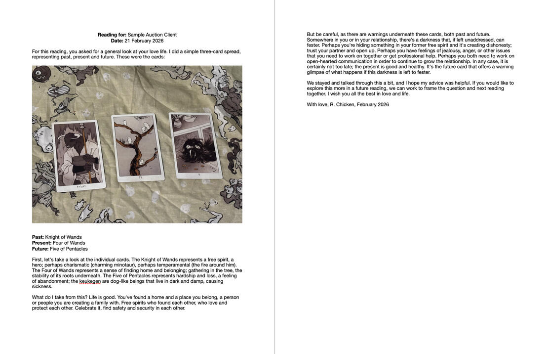 Rotisserie Chicken is a diviner, writer/role-player, crafter, and aspiring artist. She is also a dragon girl human being, not a robot! She performs divination and makes strong coffee at Souls and Sundries, a haunted magic shop and café, under the name Sakura Duskbloome.For this auction, she is offering a tarot reading and conversation, with a skrunkly drawing thrown in.You can view her regular carrd below for more examples of work: